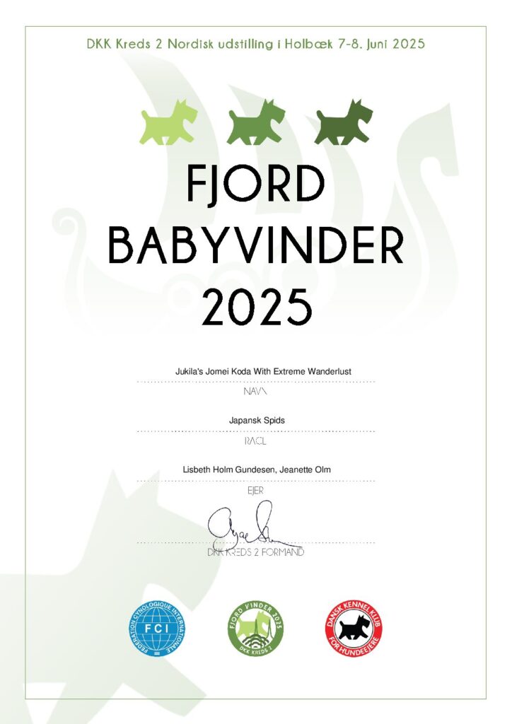 Jukila’s Jomei Koda With Extreme Wanderlust var også på udstilling i Holbæk og blev bedste baby i racen og Baby FjordVinder 25
